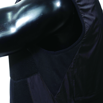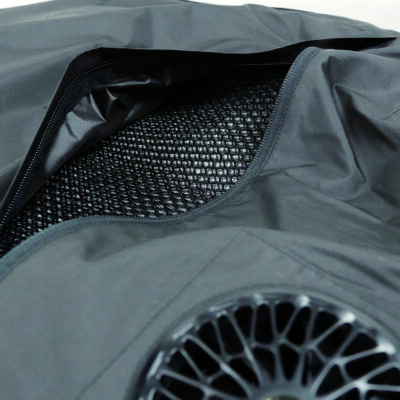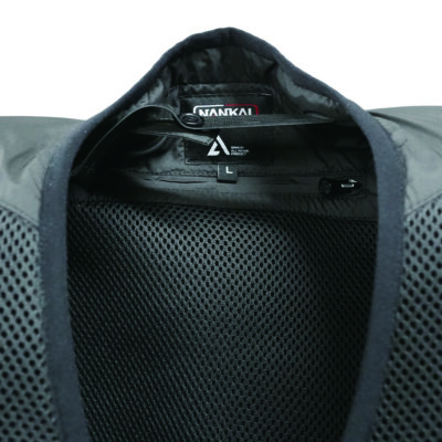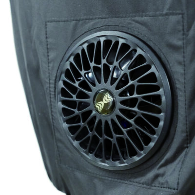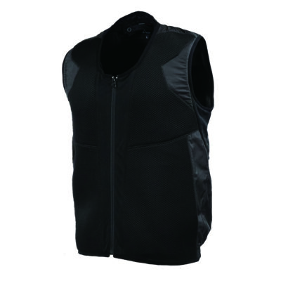フィルムから出る水蒸気と、走行風を利用し気化の原理を利用した冷却ベストに渋滞時や走行時以外でも強制して気化の促進をするファンシステム対応の気化熱+ファンライダーズベストです。