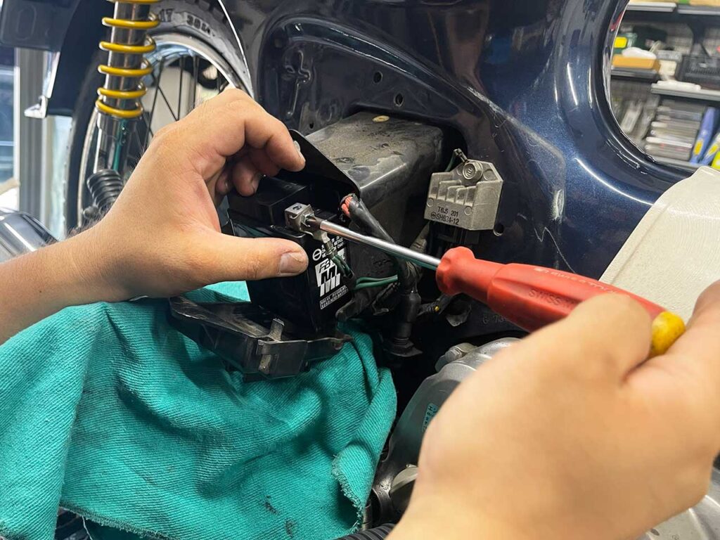 マイナス端子を外していればショートの心配はありませんが、万が一に備え、マイナス端子に配線が触れないよう注意して作業を進めて行きます。