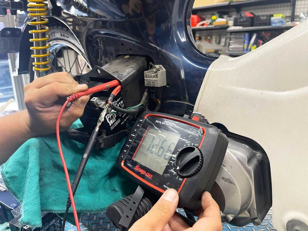 エンジン始動後も確認として、テスターを使用して電圧を測定し、不具合がないかを詳細にチェックします。