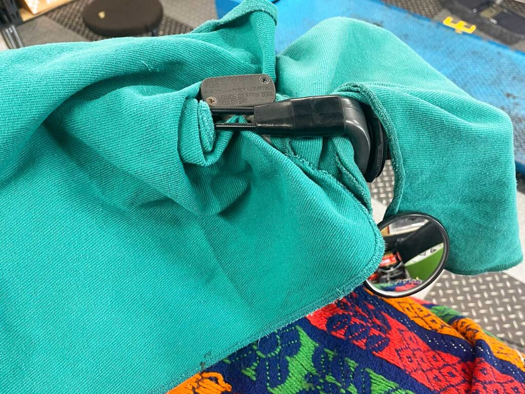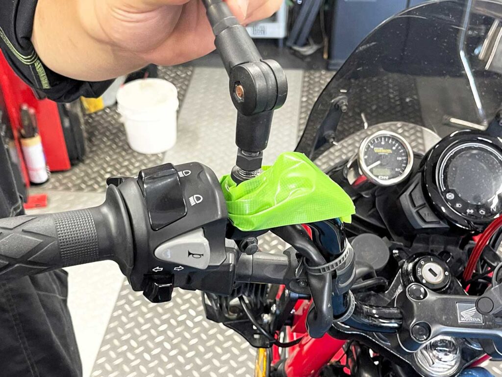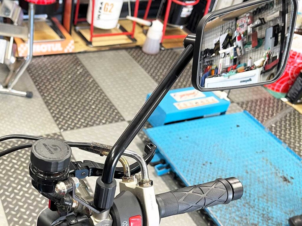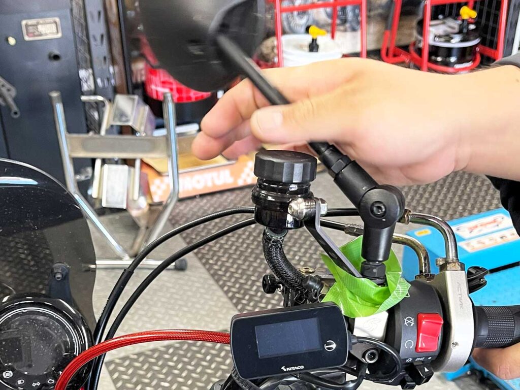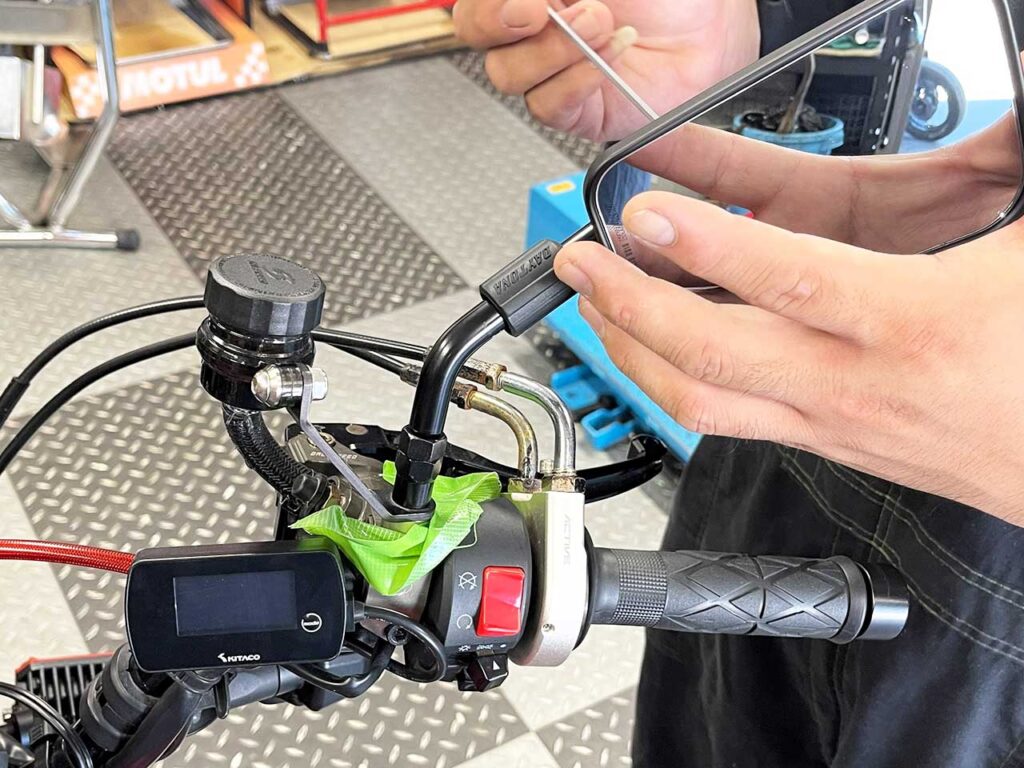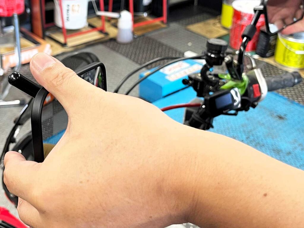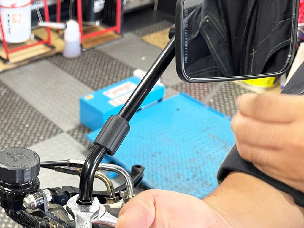 お客様に車両に跨っていただき、一番見やすい位置でミラーを固定させていただきます。