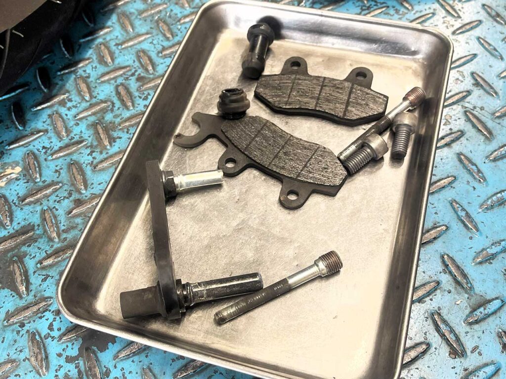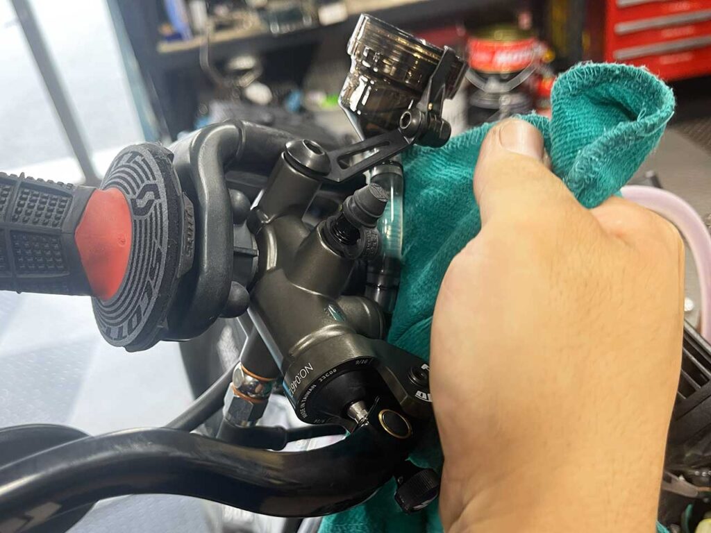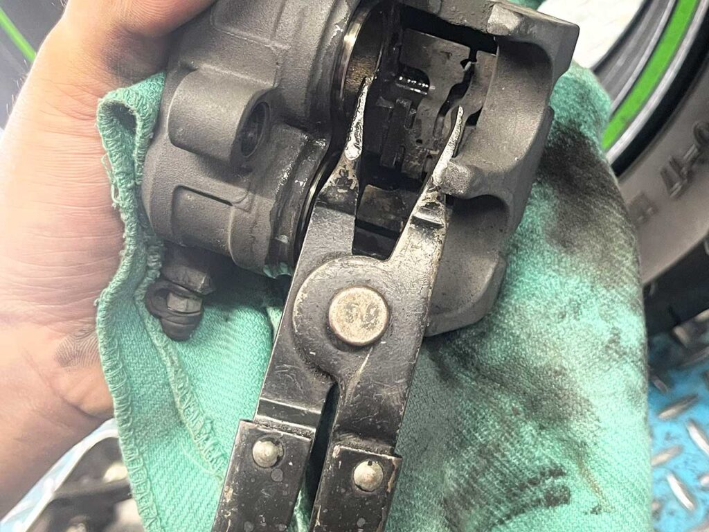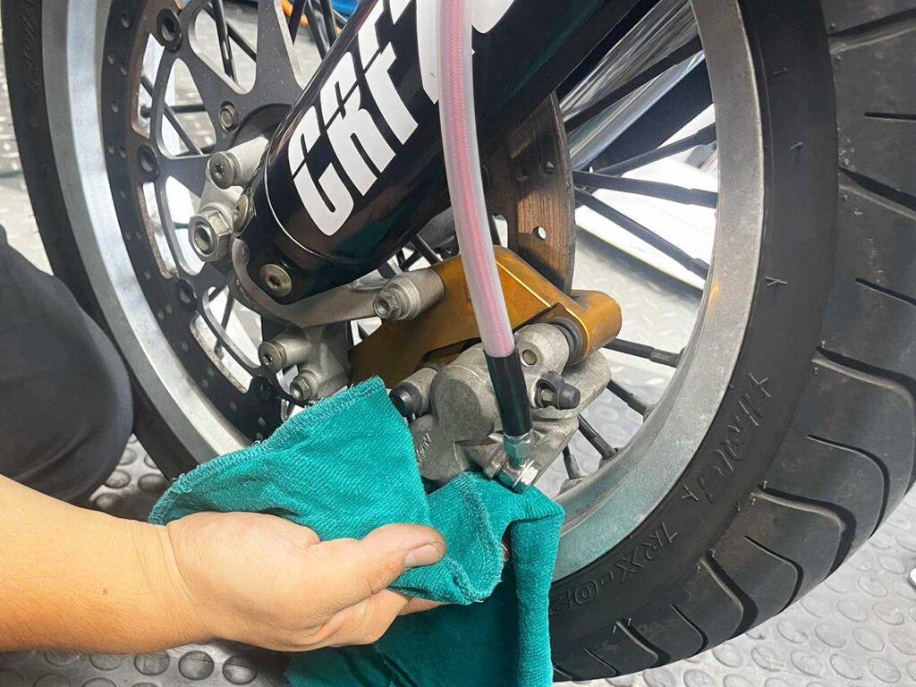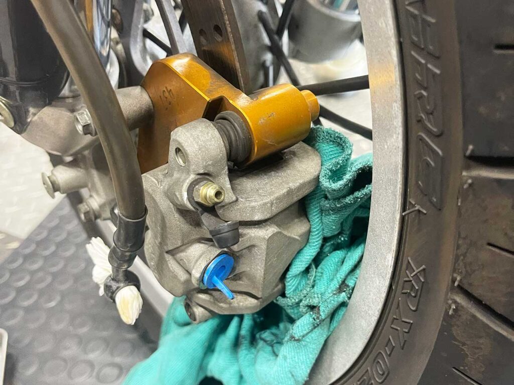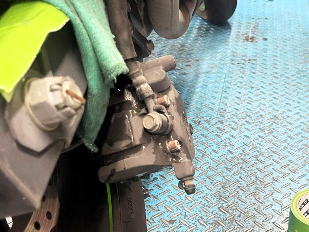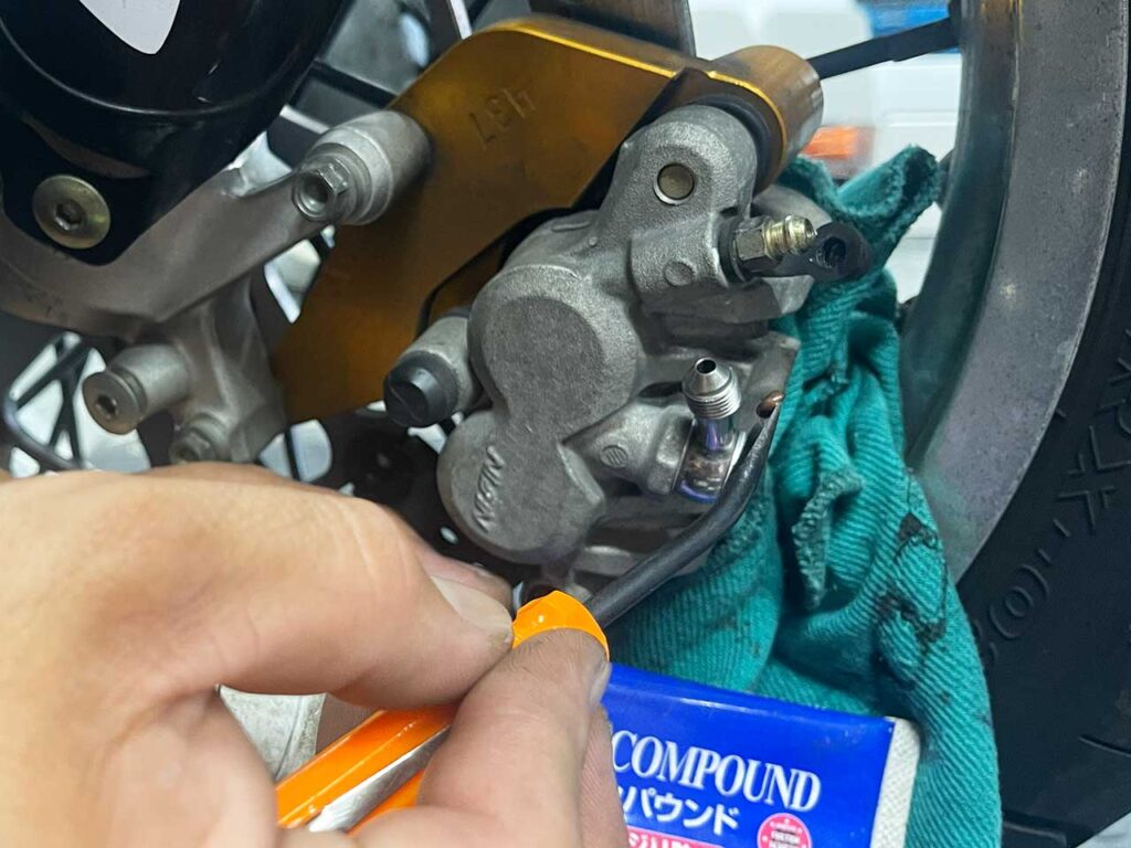 ブレーキ液が残っているため、こぼれないようにウェスなどで受け止めます。