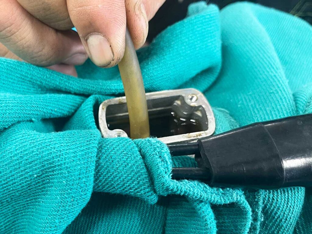 ブレーキフルードを排出する際は、専用工具を使用し、フルードが垂れるのを防ぎながら迅速に作業を進めます。