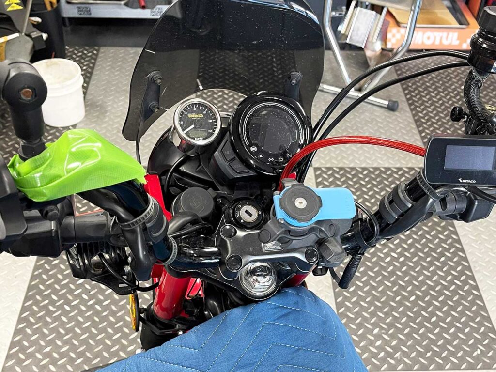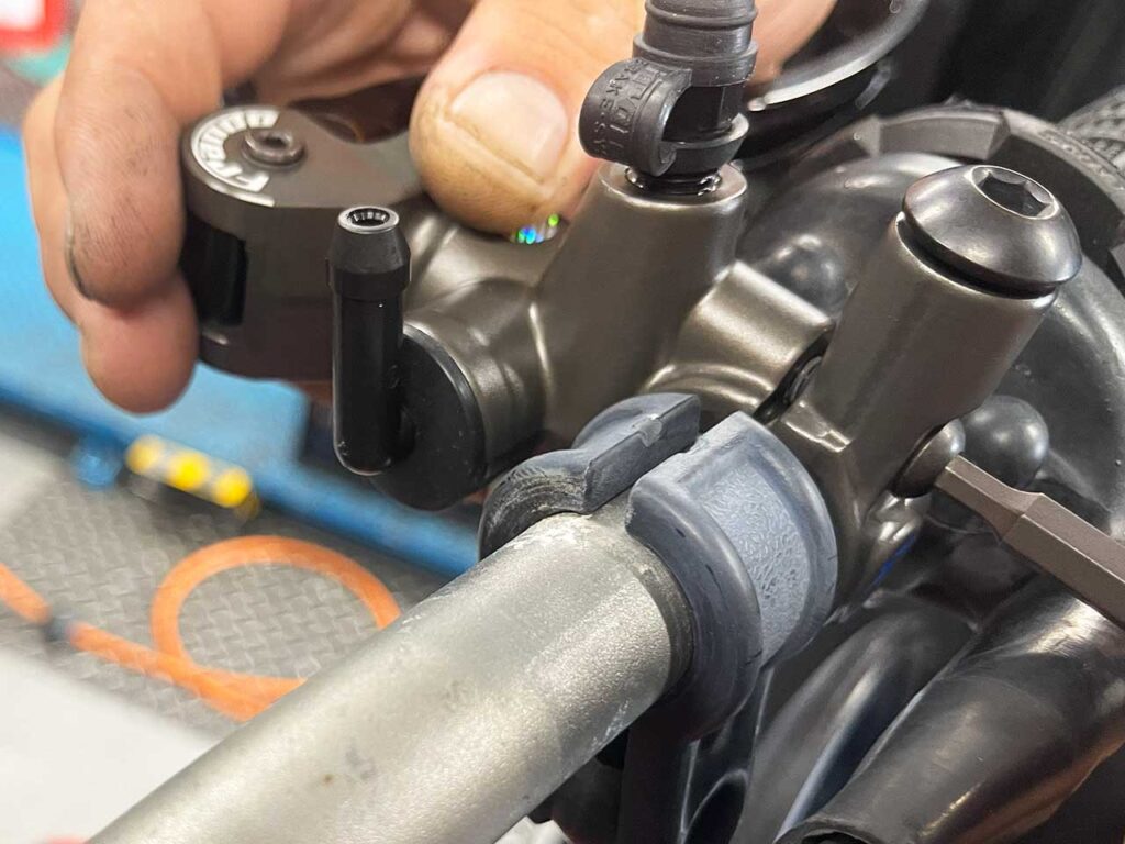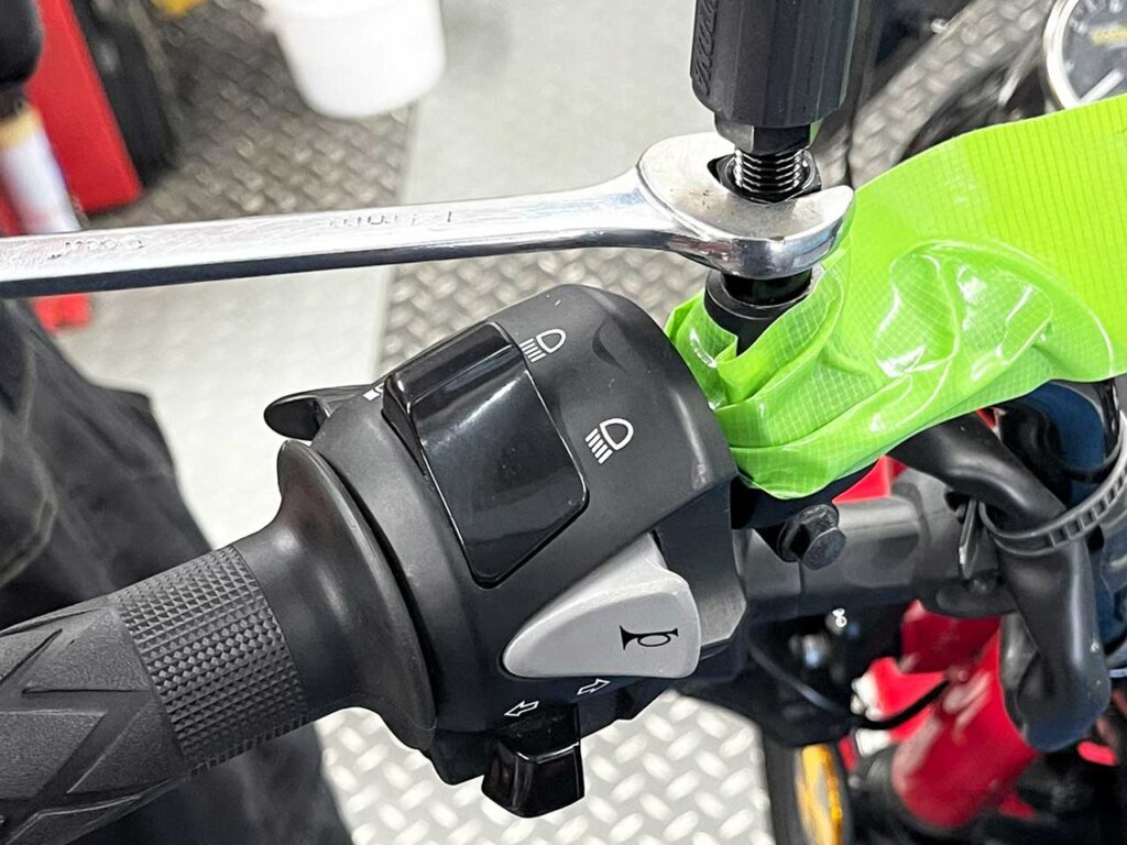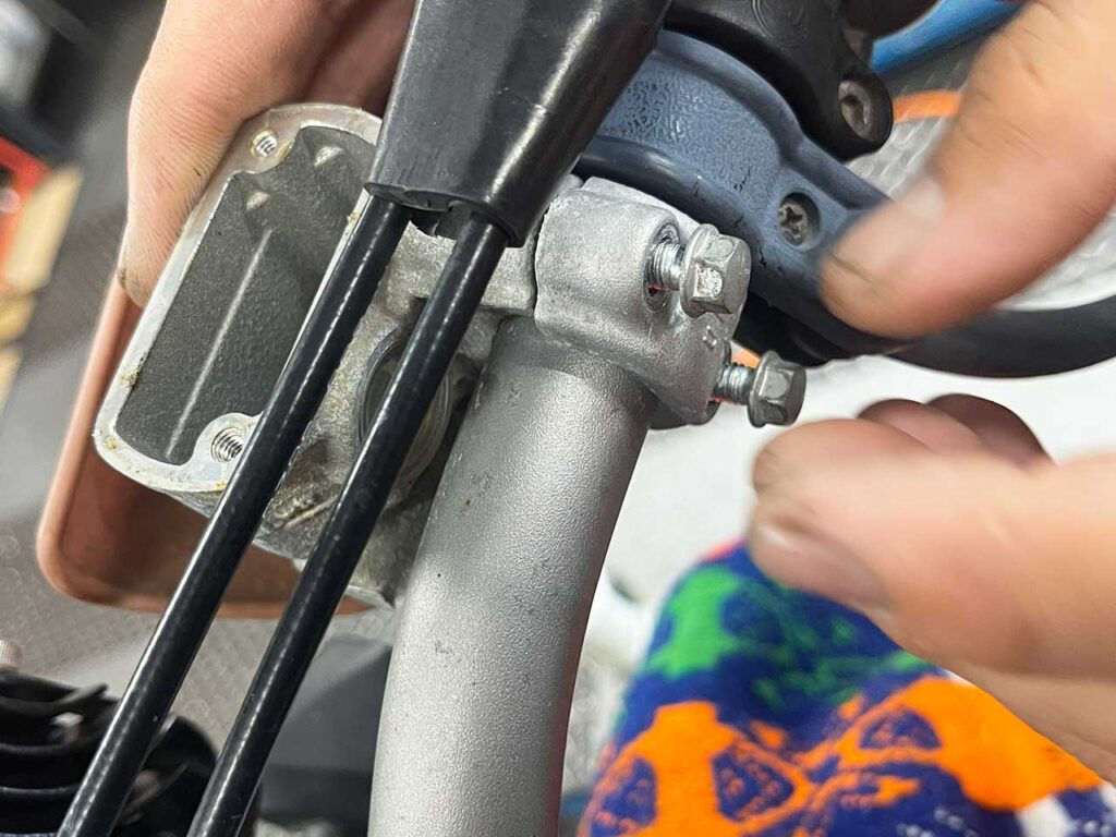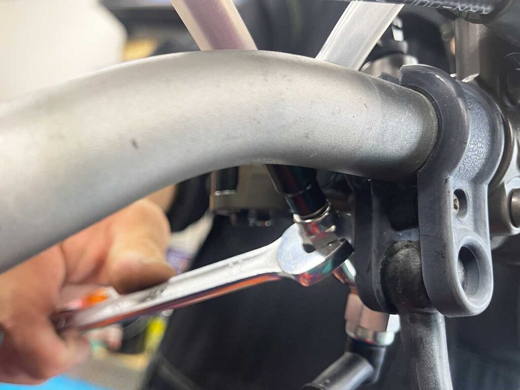 ホースやアクセルワイヤーなどの取り回しを考慮し、無理のない位置に新しいマスターシリンダーを取り付けいたします。
