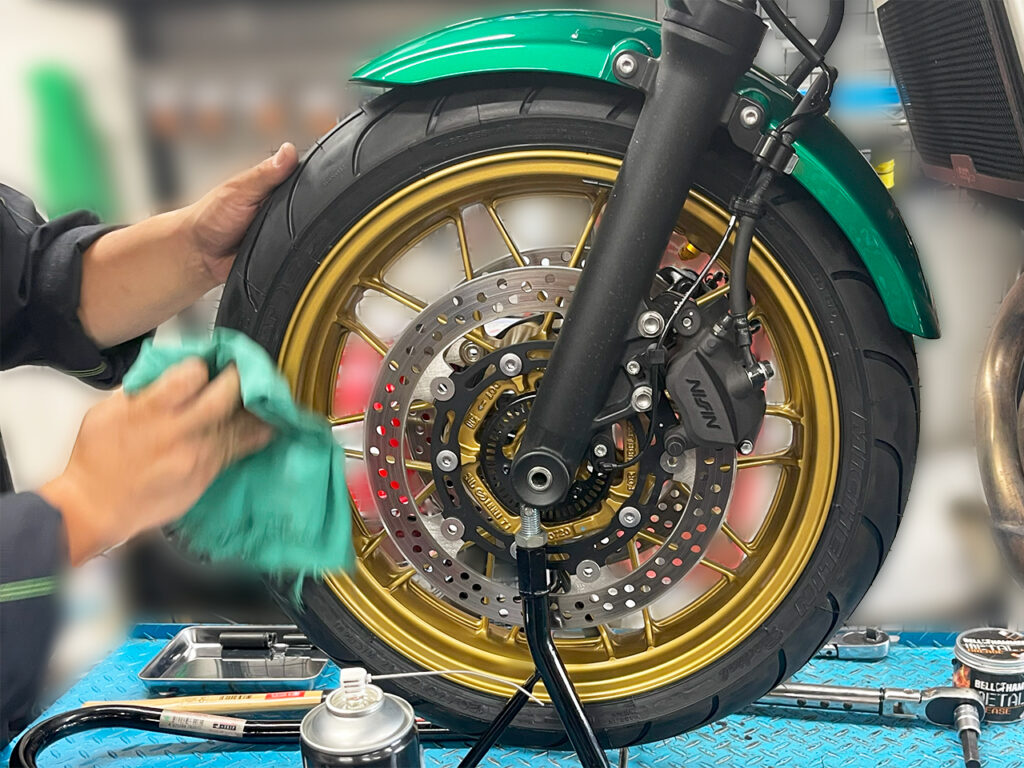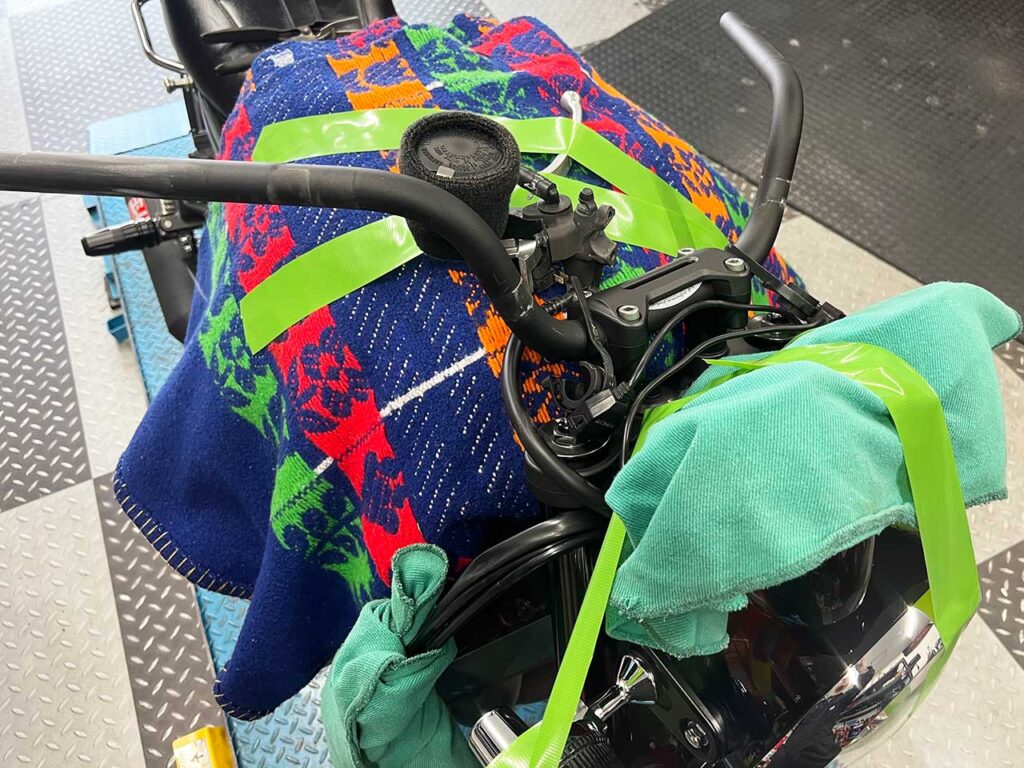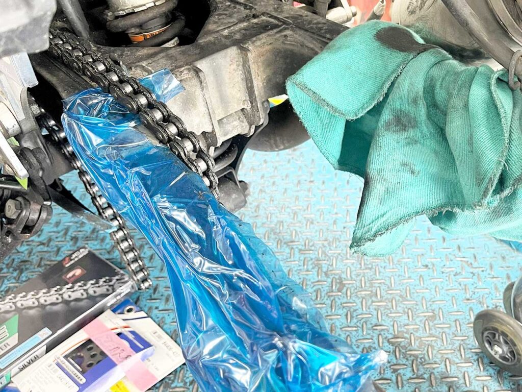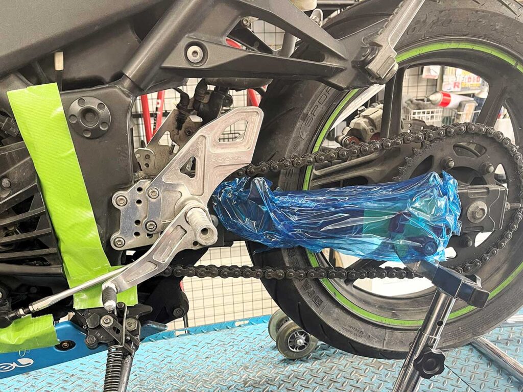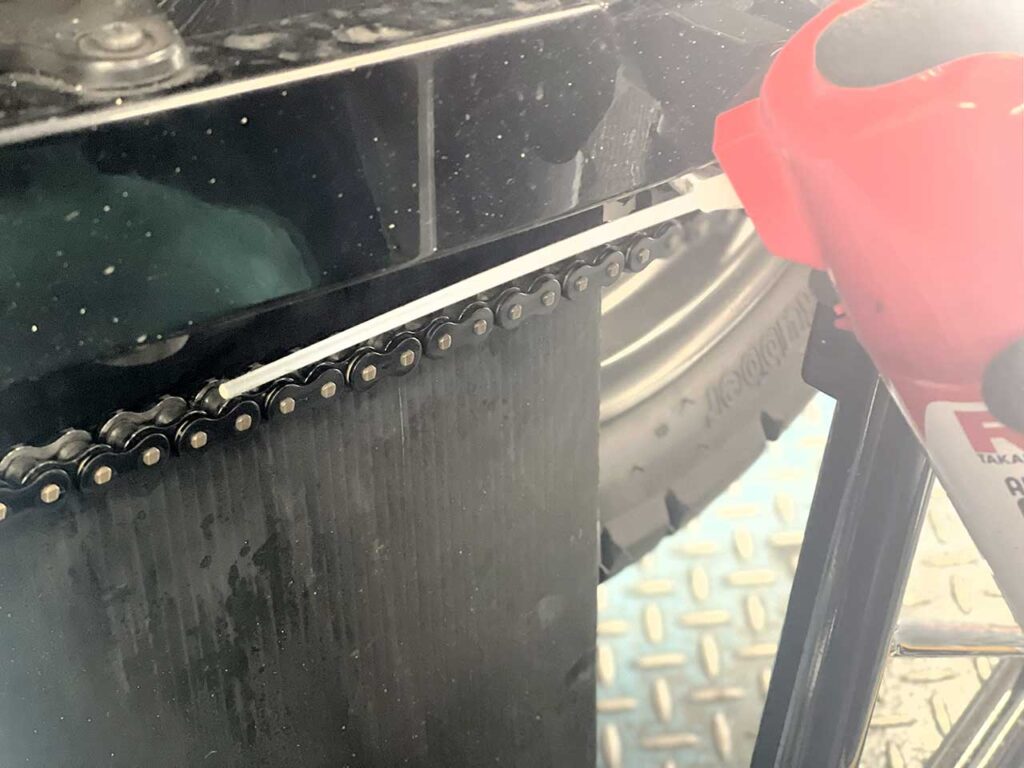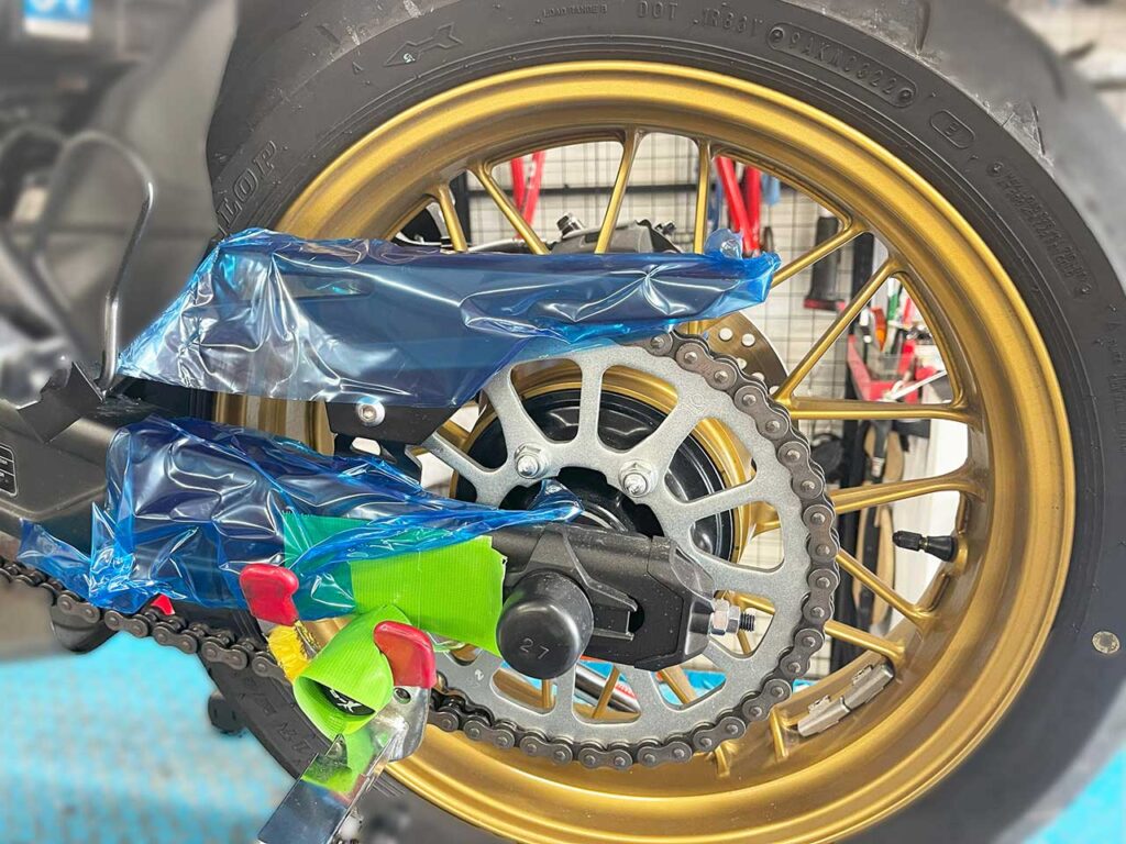 チェーンクリーナーやチェーンルブがタイヤやホイール、その他の部品に付着しないよう、ウエスや段ボールなどを用いてしっかりと養生しながら作業を進めてまいります。