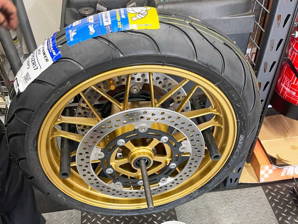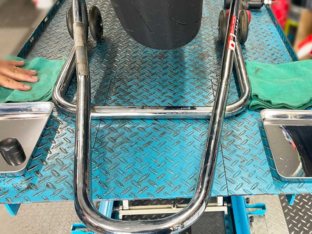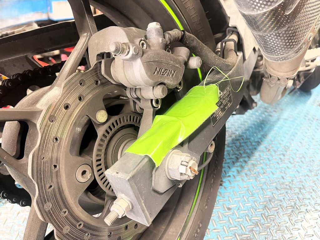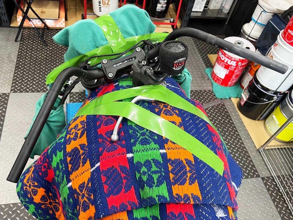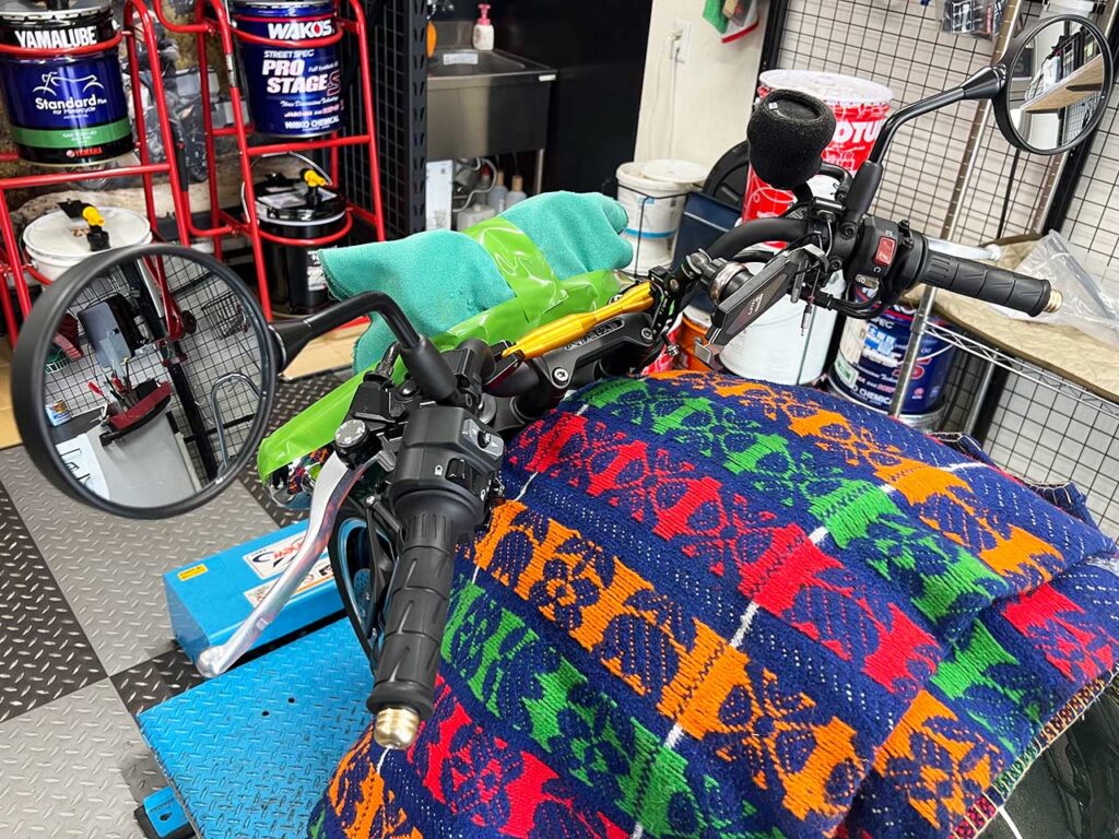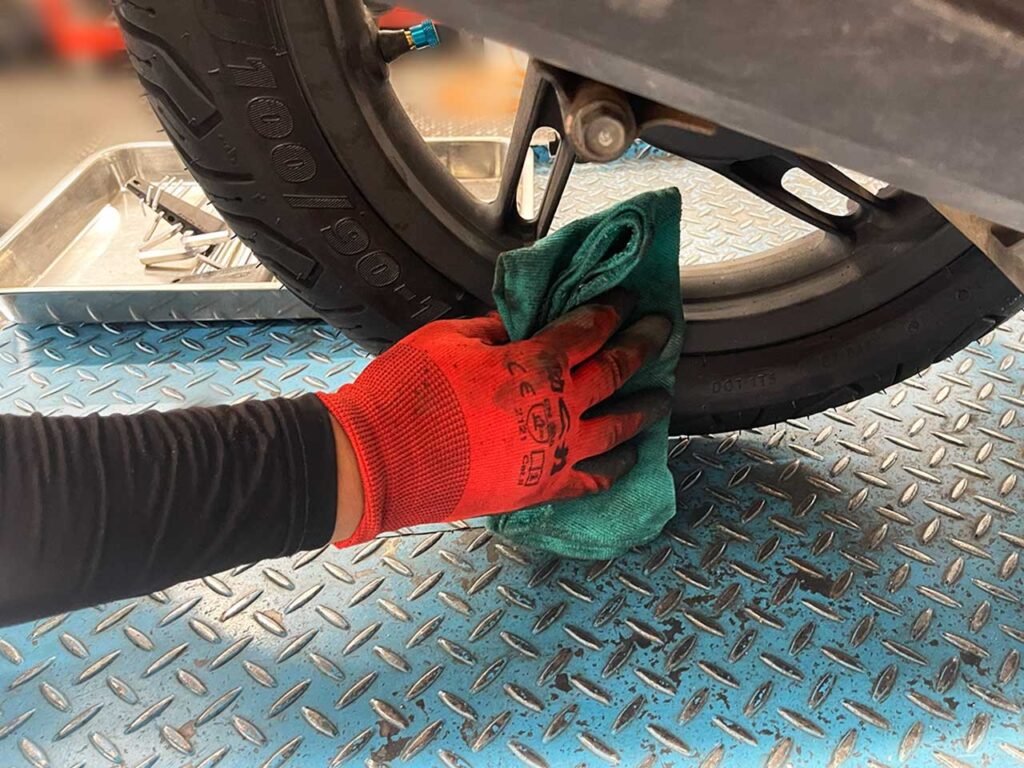 チェーンクリーナーやチェーンルブがタイヤやホイール、その他の部品に付着しないよう、ウエスや段ボールなどを用いてしっかりと養生しながら作業を進めてまいります。