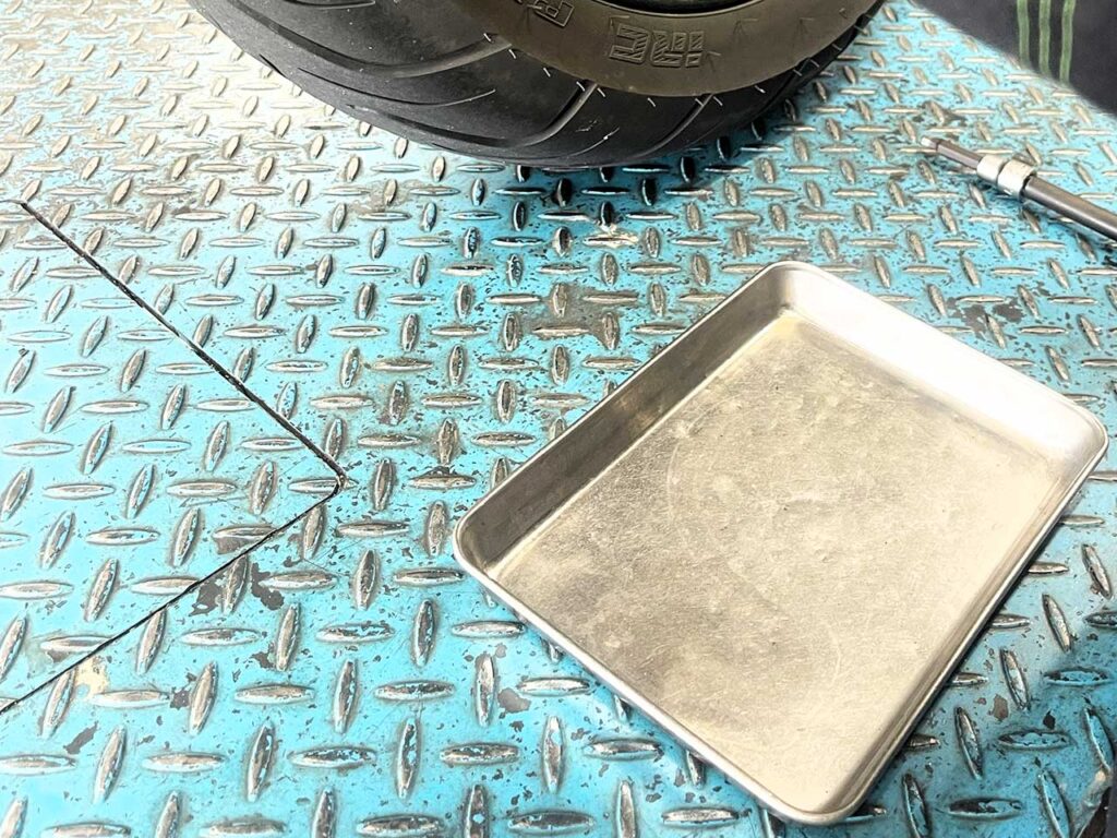 チェーンクリーナーやチェーンルブをご使用になる際は、作業場所を汚さないよう、チェーンの下にトレーを置いて飛散や液だれを防ぐようにいたします。