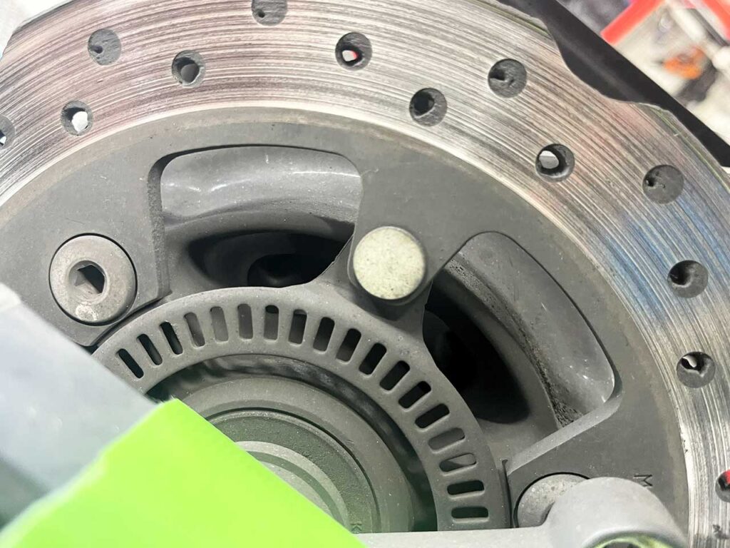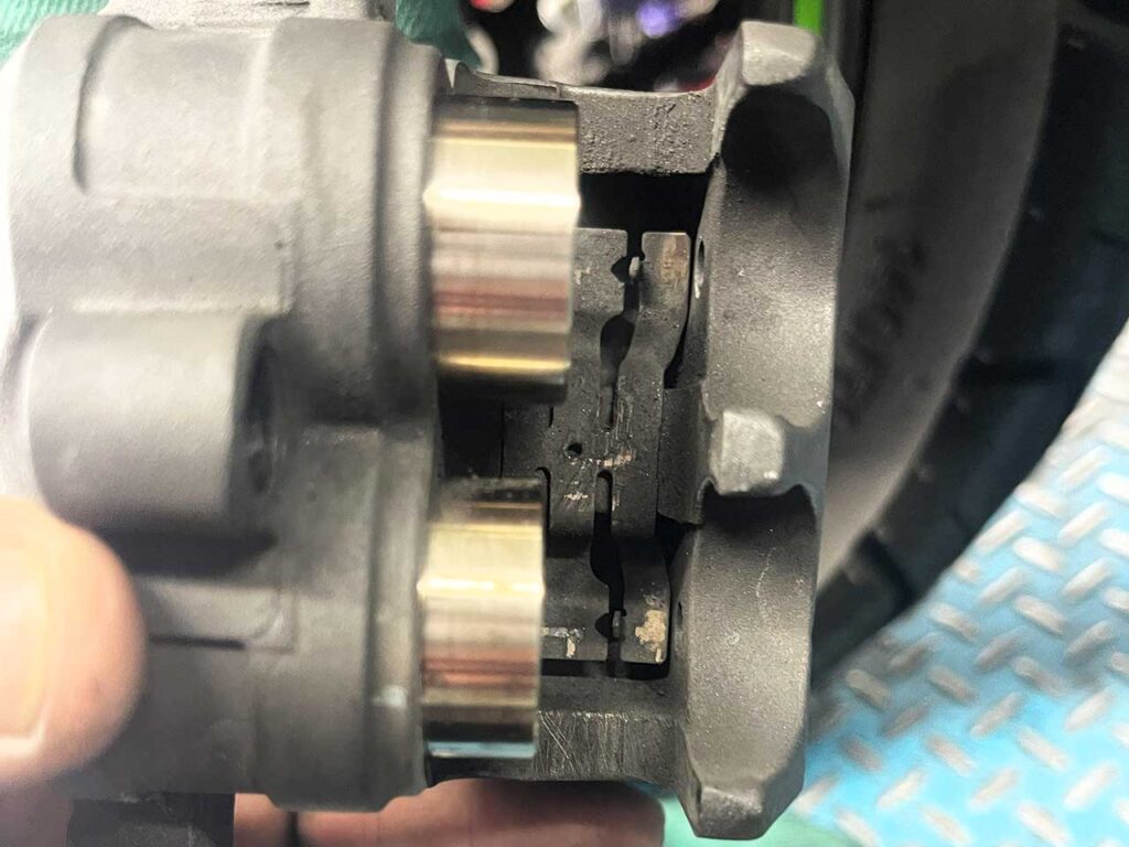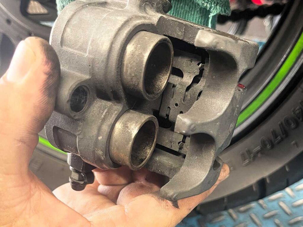 今回の作業ではブレーキホースも同時に交換いたしますので、ブレーキキャリパーからもフルードを完全に抜き取ります。