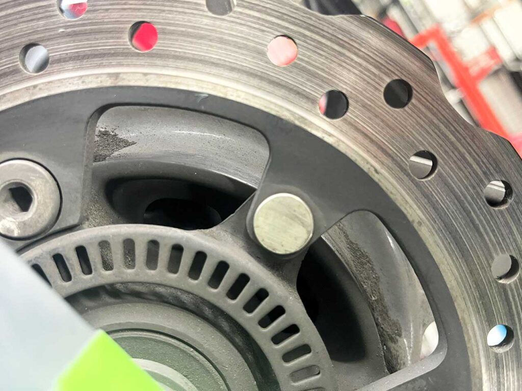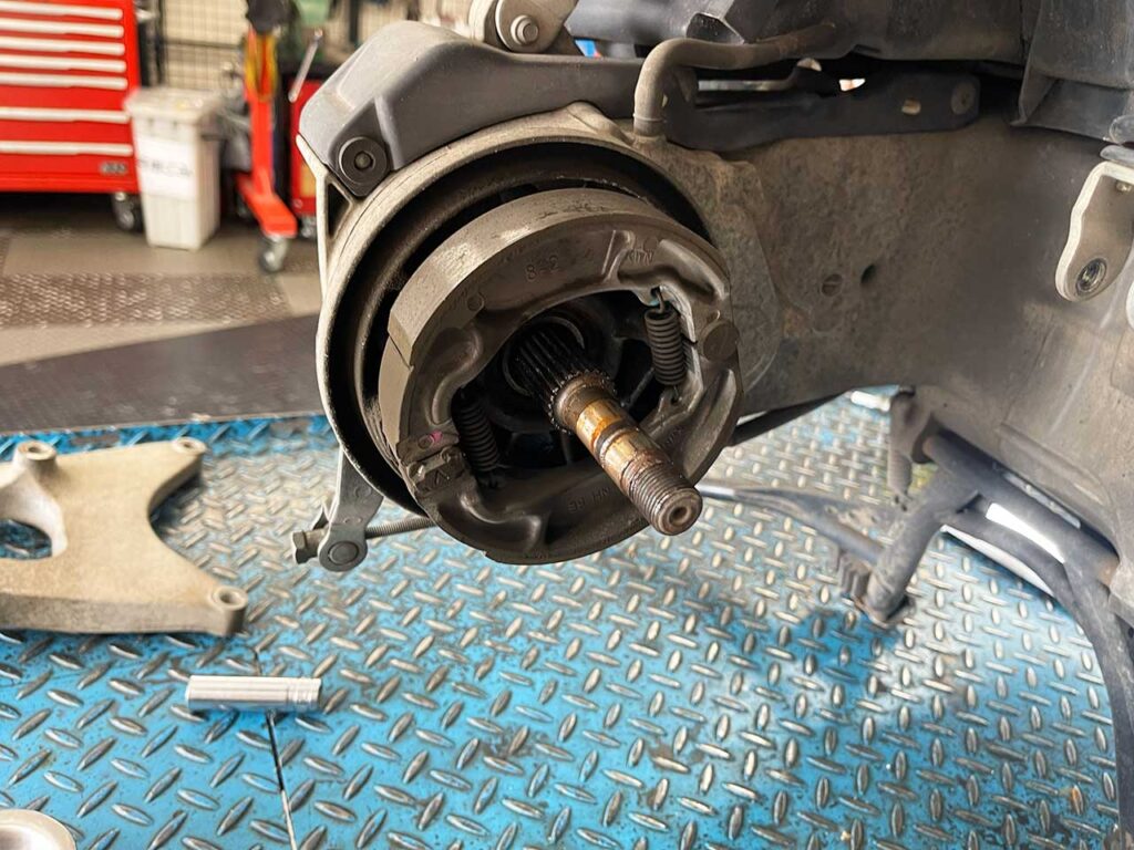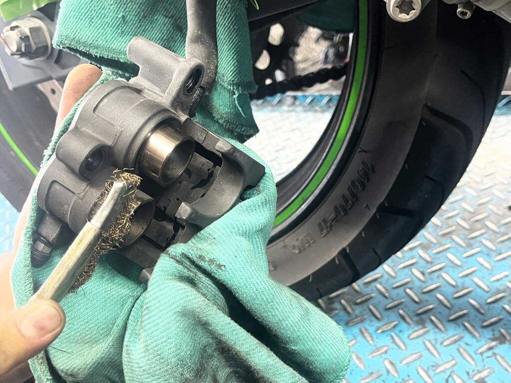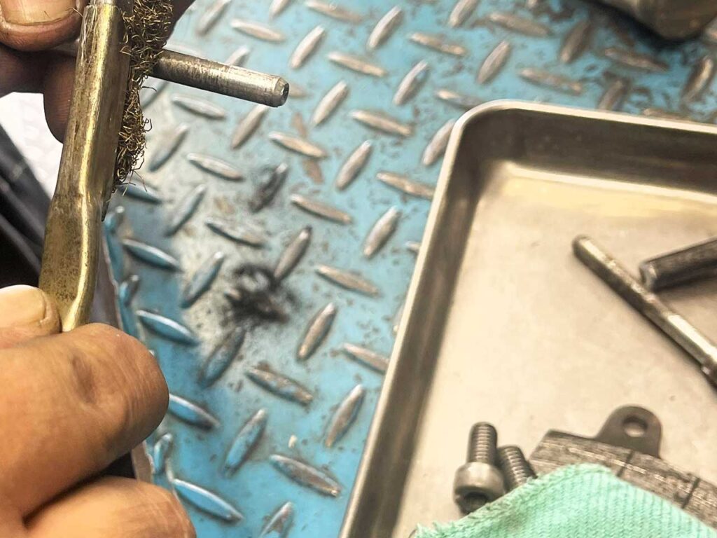スプロケットを取り外したら、パーツクリーナーとブラシを使って、周辺を丁寧に清掃します。
