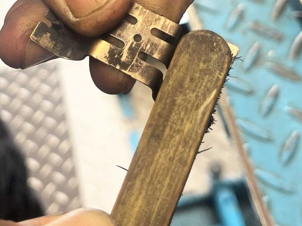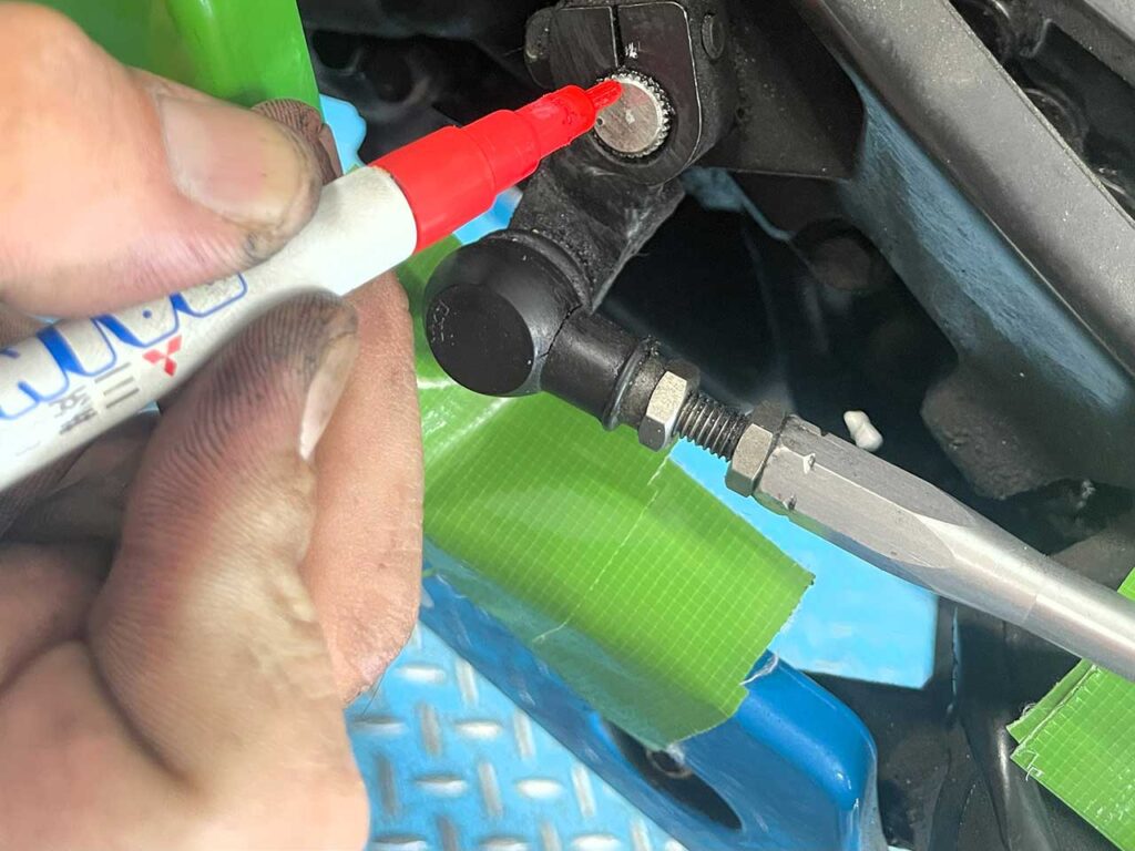 チェンジペダルの取り付け部には細かいギザギザがあり、わずかなずれでも操作感が変わってしまうため、お客様が乗りやすいポジションを正確に把握できるよう、常にマーキングを行っております。