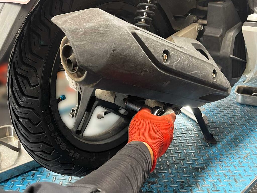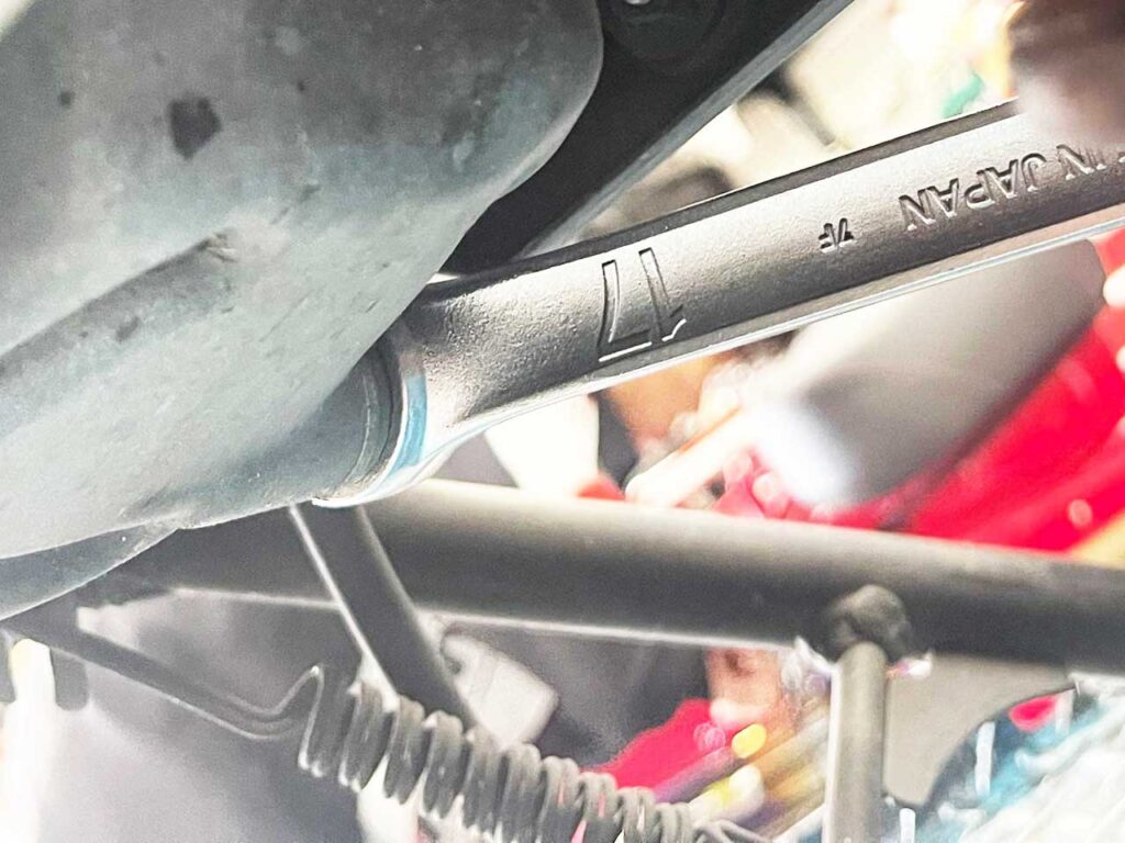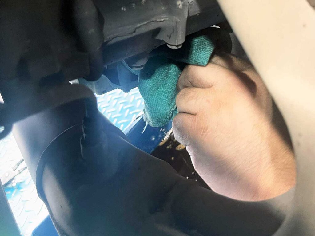 ドレンボルトを規定トルクで締め付け、その後、ドレンボルト付近に付着したエンジンオイルをパーツクリーナーで洗浄します。