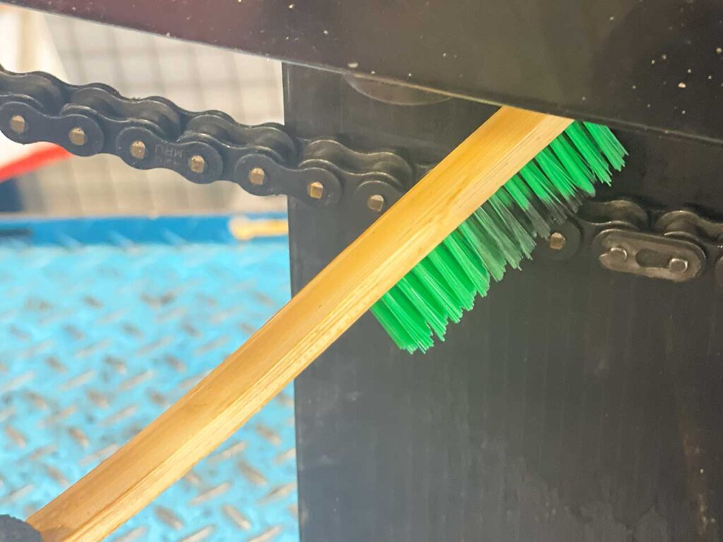 チェーンクリーナーで浮き上がった汚れをブラシで丁寧にこすり落とします。