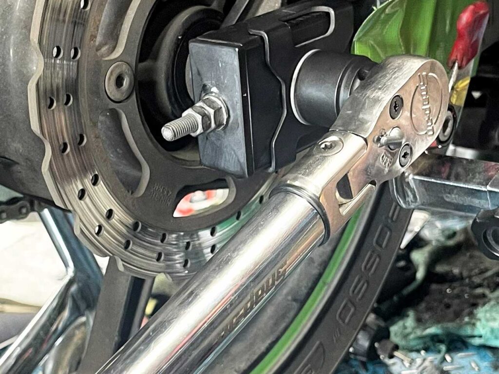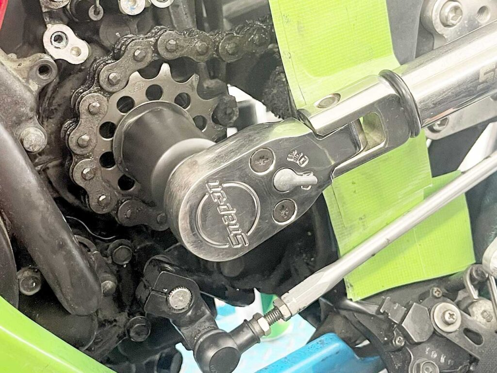 リアアクスルシャフトナットを締める前に、チェーンの張りを調整します。
