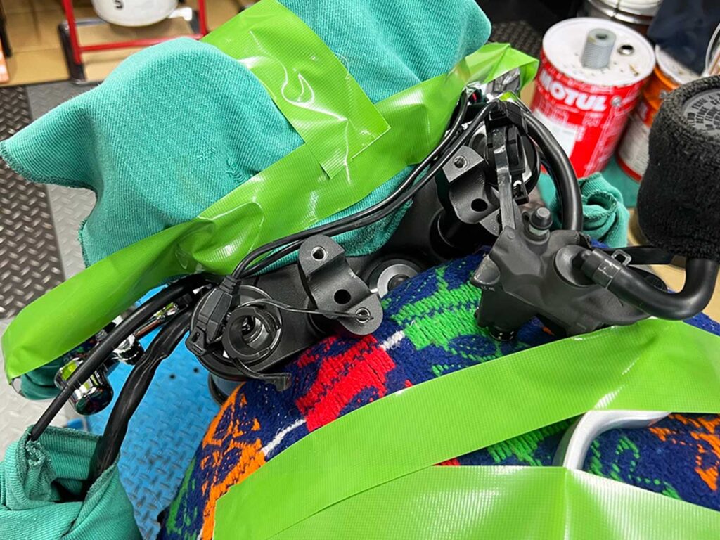 パーツや工具が接触して傷がつく可能性のある部分には養生テープやウエスやクッションシート等で、傷を未然に防ぎます。