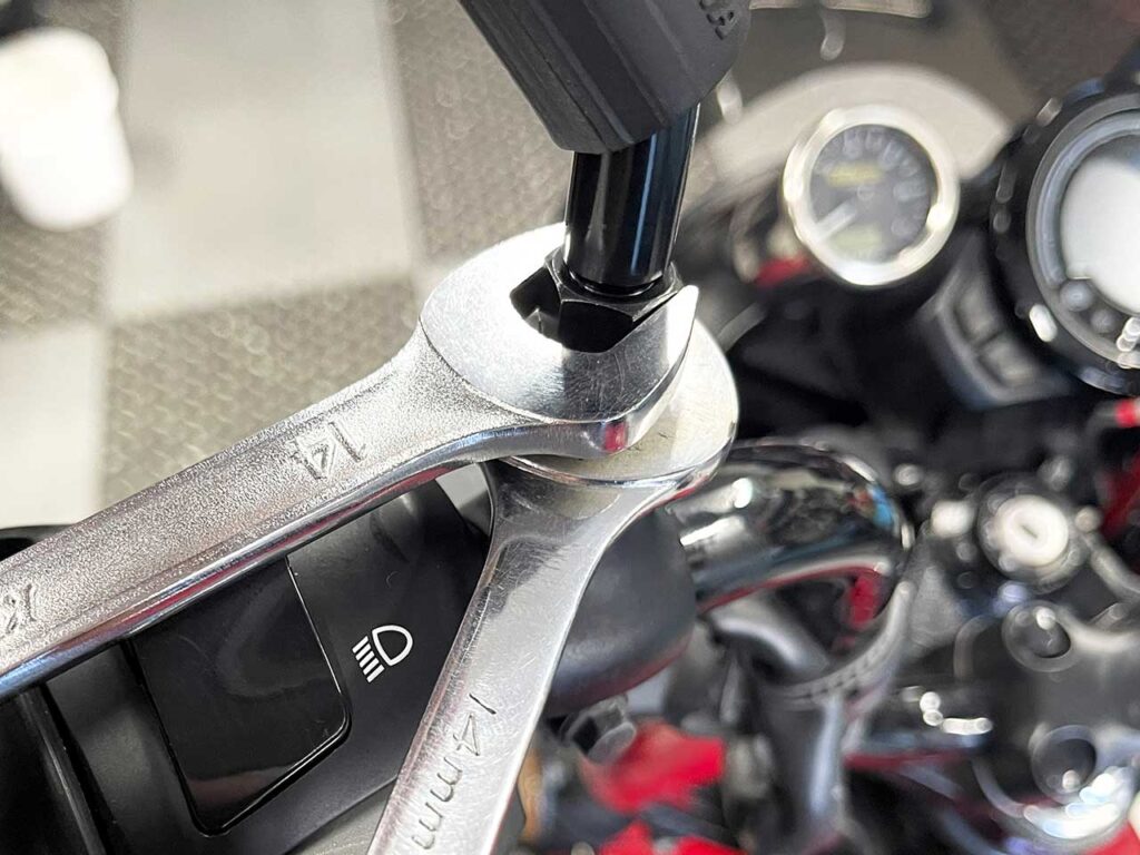 ミラーの付け根にあるキャップ(ブーツ)をずらし、スパナでロックナットを緩めます。