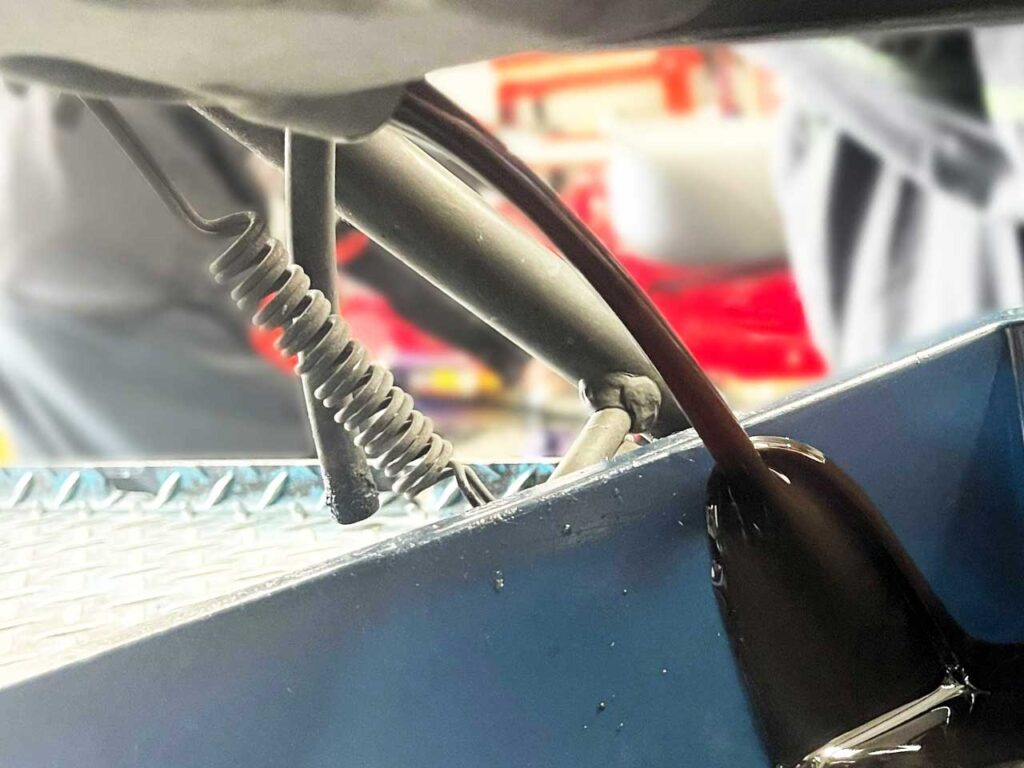 ブレーキホースの接続位置が下向きに変更になるため、配線との取り回しを考慮します。