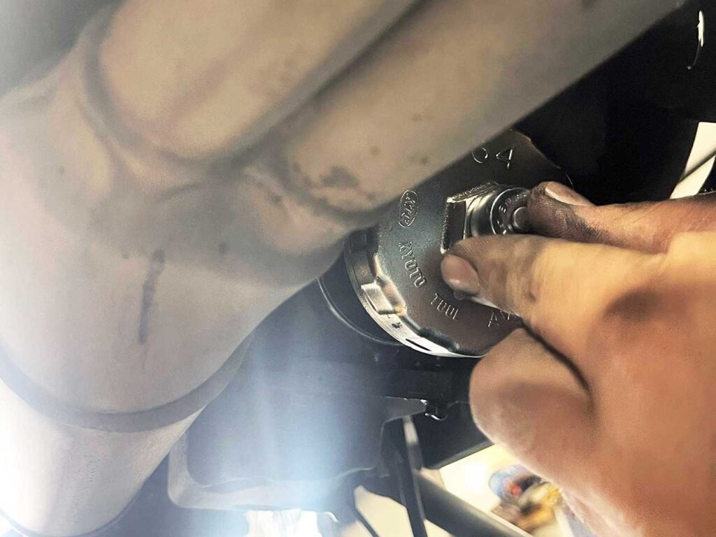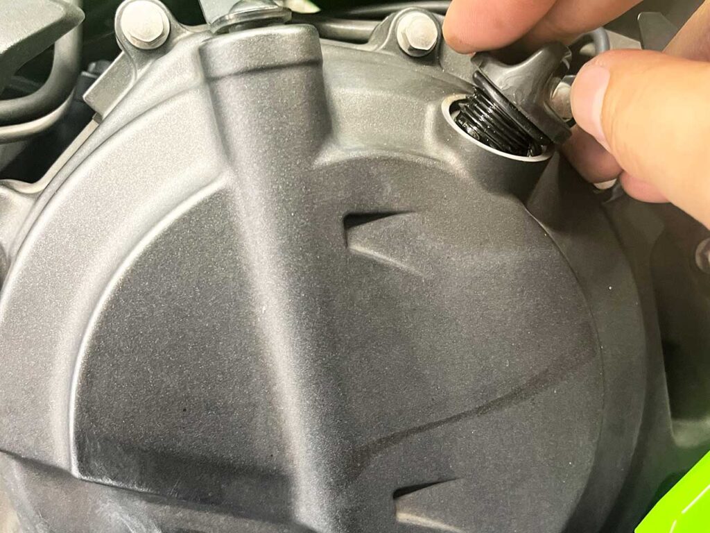 取り付けの際は、締め付ける前に取り付け口のゴム製Oリングに新しいエンジンオイルを軽く塗布し、Oリングがよじれないように注意して取り付けます。