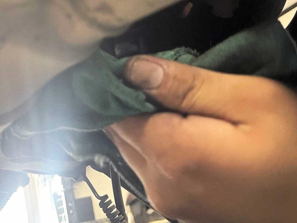 ドレンボルトに付着した汚れは、ネジ山を痛めさせる可能性があるため、パーツクリーナーとウエスを使って汚れを除去します。