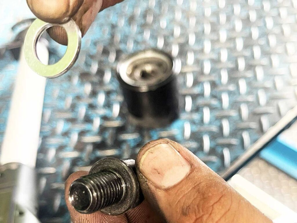 この箇所には、ネジロックや緩み止めのワッシャーが使用されていることが多いです。