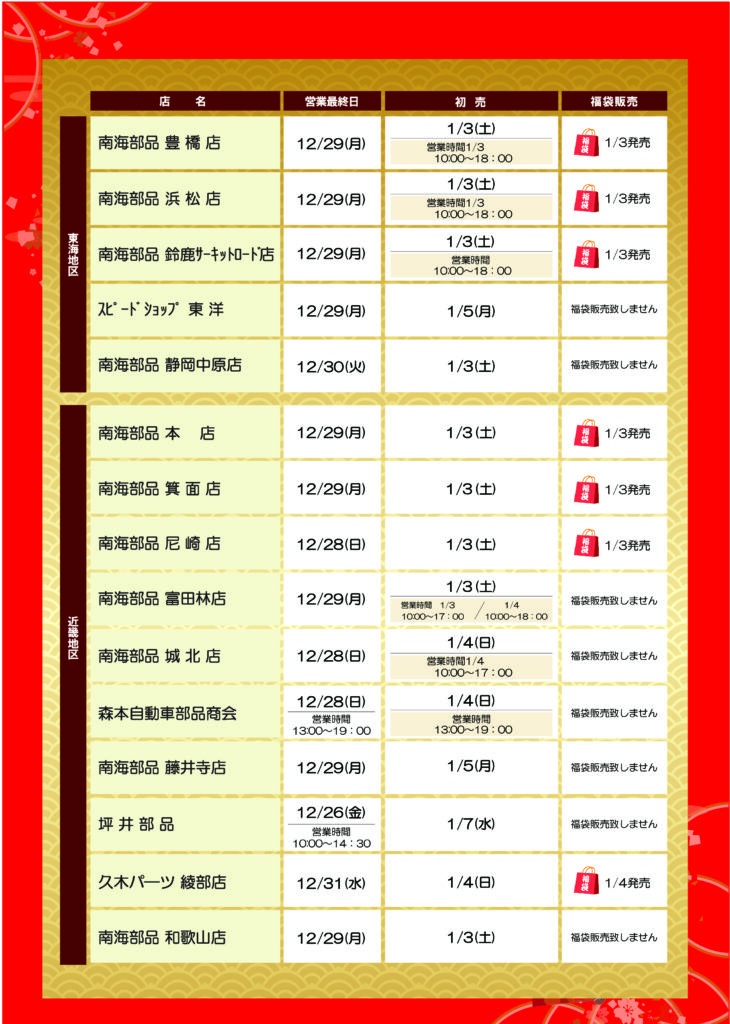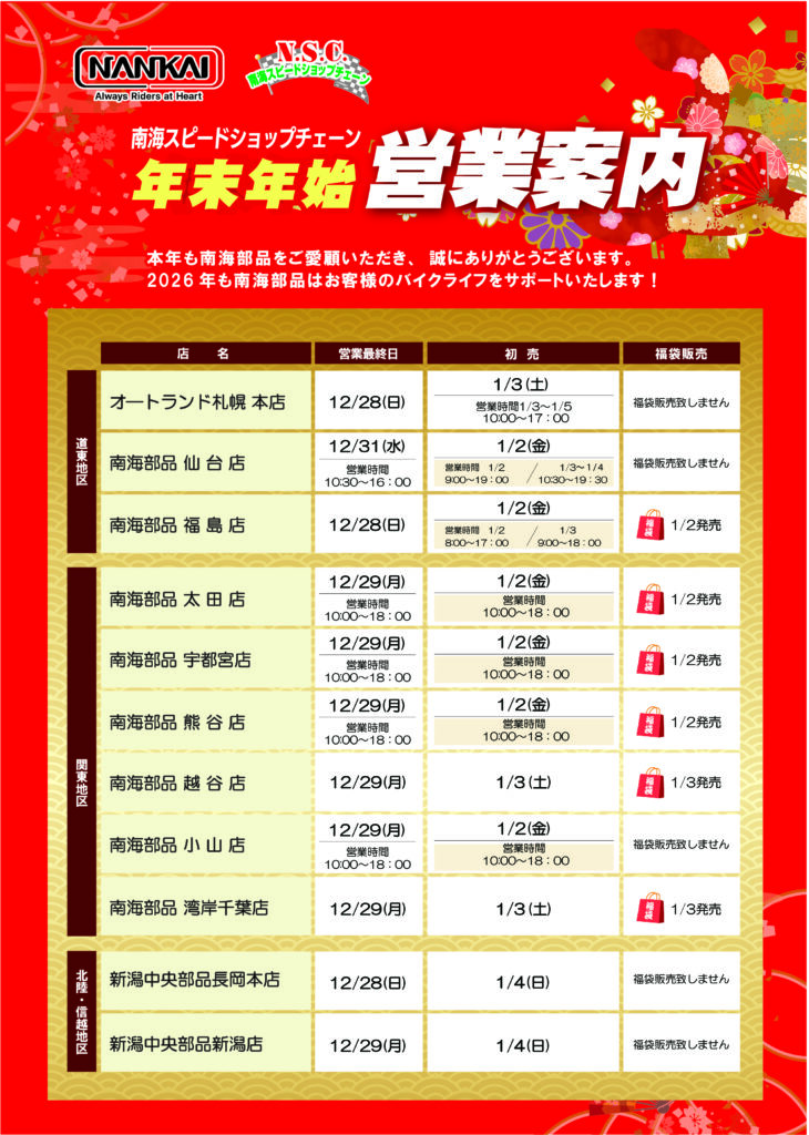 TOP ニュース 南海スピードショップチェーン年末年始営業案内 NEWS 南海部品からのお知らせ ARCHIVE 選択してください すべて 2025年12月 2025年11月 2025年10月 2025年9月 2025年8月 2025年7月 2025年6月 2025年5月 2025年4月 2025年3月 2025年2月 2025年1月 2024年12月 2024年11月 2024年10月 2024年9月 2024年8月 2024年7月 2024年6月 2024年5月 2024年4月 2024年3月 2024年2月 2024年1月 2023年12月 2023年11月 2023年10月 2023年9月 2023年8月 2023年7月 2023年4月 2023年3月 2023年2月 企業ニュース 2025.12.24 南海スピードショップチェーン年末年始営業案内 本年も南海部品をご愛顧いただき、誠にありがとうございます。2026年も南海部品はお客様のバイクライフをサポートいたします。 営業日・休業日につきましては、下記のカレンダーをご確認ください。皆さまのご来店を心よりお待ちしております。 BACK CATEGORY カテゴリー すべて 企業ニュース レースレポート お知らせ イベント情報 店舗ニュース ARCHIVE アーカイブ 選択してください すべて 2025年12月 2025年11月 2025年10月 2025年9月 2025年8月 2025年7月 2025年6月 2025年5月 2025年4月 2025年3月 2025年2月 2025年1月 2024年12月 2024年11月 2024年10月 2024年9月 2024年8月 2024年7月 2024年6月 2024年5月 2024年4月 2024年3月 2024年2月 2024年1月 2023年12月 2023年11月 2023年10月 2023年9月 2023年8月 2023年7月 2023年4月 2023年3月 2023年2月