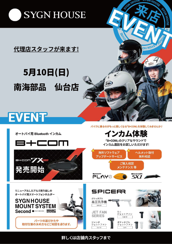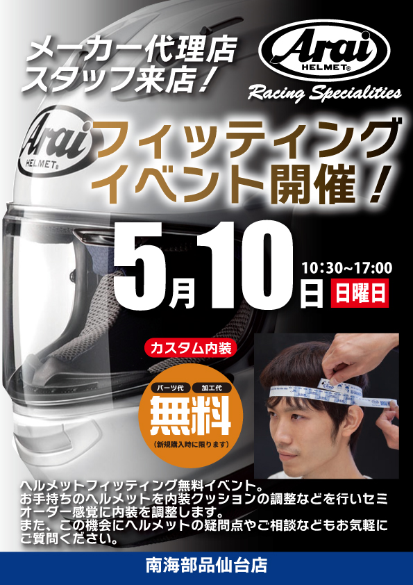 TOP ニュース 5月10日(日) 南海部品 仙台店にてイベント開催のお知らせ NEWS 南海部品からのお知らせ ARCHIVE 選択してください すべて 2026年4月 2026年2月 2026年1月 2025年12月 2025年11月 2025年10月 2025年9月 2025年8月 2025年7月 2025年6月 2025年5月 2025年4月 2025年3月 2025年2月 2025年1月 2024年12月 2024年11月 2024年10月 2024年9月 2024年8月 2024年7月 2024年6月 2024年5月 2024年4月 2024年3月 2024年2月 2024年1月 2023年12月 2023年11月 2023年10月 2023年9月 2023年8月 2023年7月 2023年4月 2023年3月 2023年2月 店舗ニュース 2026.04.17 5月10日(日) 南海部品 仙台店にてイベント開催のお知らせ Araiフィッティングイベント 開催SYGN HOUSE新型インカム体験会開催 ヘルメットの内装調整・お悩みの事をご相談できます!この機会にどうでしょうか!?ご来店お待ちしております! 話題の新モデルの7X EVOもご覧いただけます。是非、ご来店お待ちしております。 ※詳しくは南海部品仙台店にてお問い合わせください。南海部品仙台店の店舗ページはこちらより BACK CATEGORY カテゴリー すべて 企業ニュース レースレポート お知らせ イベント情報 店舗ニュース ARCHIVE アーカイブ 選択してください すべて 2026年4月 2026年2月 2026年1月 2025年12月 2025年11月 2025年10月 2025年9月 2025年8月 2025年7月 2025年6月 2025年5月 2025年4月 2025年3月 2025年2月 2025年1月 2024年12月 2024年11月 2024年10月 2024年9月 2024年8月 2024年7月 2024年6月 2024年5月 2024年4月 2024年3月 2024年2月 2024年1月 2023年12月 2023年11月 2023年10月 2023年9月 2023年8月 2023年7月 2023年4月 2023年3月 2023年2月