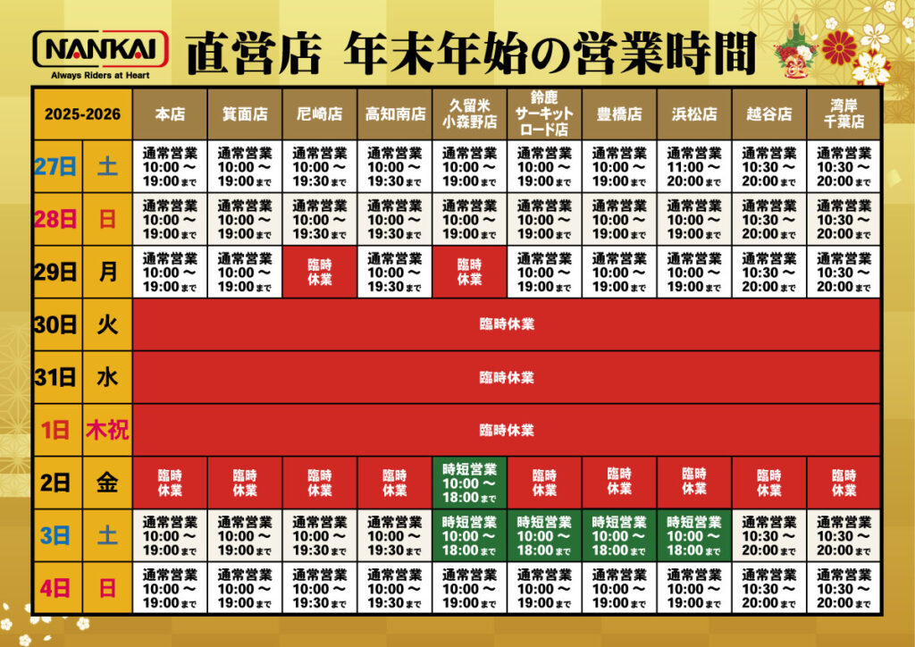 南海部品 本店・箕面店・豊橋店・浜松店・久留米小森野店・鈴鹿サーキットロード店・湾岸千葉店・越谷店・高知南店