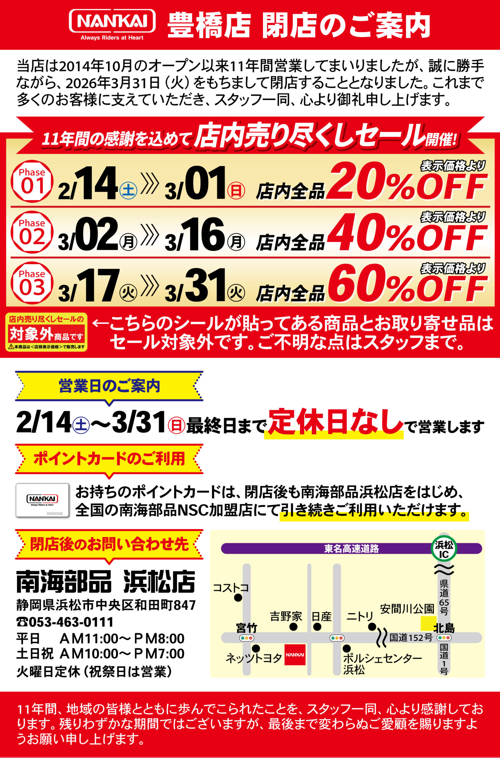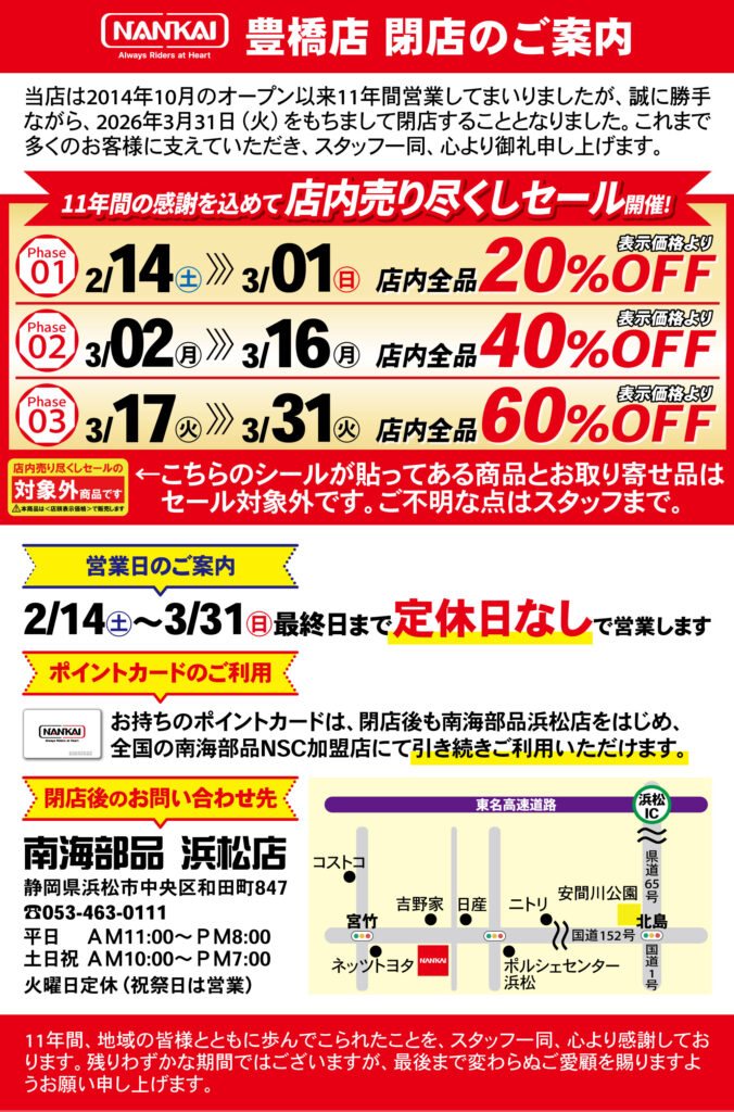 - 閉店後のお問い合わせは、南海部品浜松店へお願い致します。